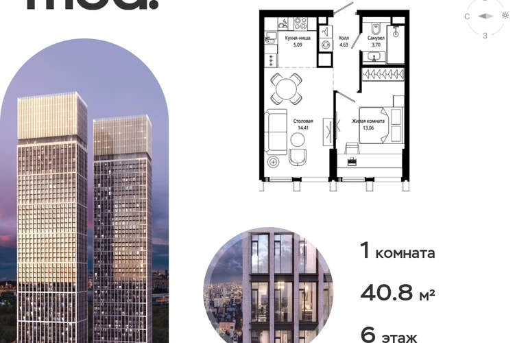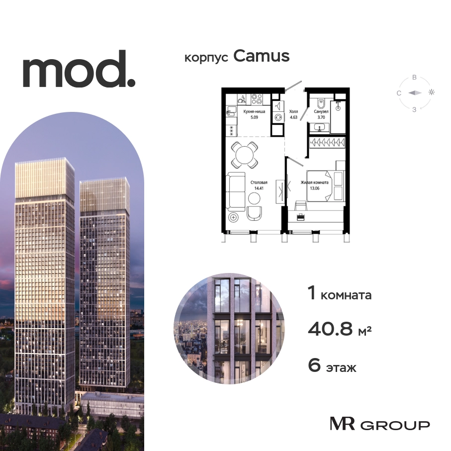 Прямая продажа от застройщика. Жилой комплекс премиум-класса Mod. Продается 1-к квартира общей площадью 40.89 кв. м с предчистовой отделкой в ЖК Mod на 6-м этаже 44 этажного дома. Mod - жилой комплекс премиум-класса в историческом районе Москвы Марьина Роща. Пятый корпус станет частью единого высотного ансамбля, который поднимается над столицей и очерчивает новый горизонт города. Расположение корпуса Mod.C отличается тем, что виды на юго-запад Москвы не ограничены существующей застройкой. Почти все главные доминанты столицы — как на ладони: от сталинских высоток до небоскрёбов делового центра. Любоваться достопримечательностями будет вдвойне приятнее через панорамные окна. Закрытая территория жилого комплекса, продуманное благоустройство, эксплуатируемые кровли стилобата, образовательный центр с детским садом создают приватное пространство для тихой семейной жизни, а городская площадь с фонтанами, ресторан, супермаркет, коммерческая инфраструктура на первых этажах привносят созвучную с ритмом города динамику. Преимущества проекта: • В шаговой доступности новый деловой кластер Москвы • Выразительная авторская архитектура • Единственные в Москве фасады башен из натурального камня • Панорамное остекление и высота потолков до 4,8 м • Квартиры и апартаменты с отделкой MR Base • Многоуровневое благоустройство с зонированием на закрытой территории • Многофункциональный образовательный детский центр с детским садом • Двухуровневый подземный паркинг Транспортная доступность: • 5 минут пешком до станции метро «Марьина роща» • 3 минуты до ТТК • 15 минут до Цветного бульвара Компания MR Group предлагает своим клиентам специальные условия приобретения квартир в рамках программ ипотечного кредитования от банков-партнеров.О застройщике