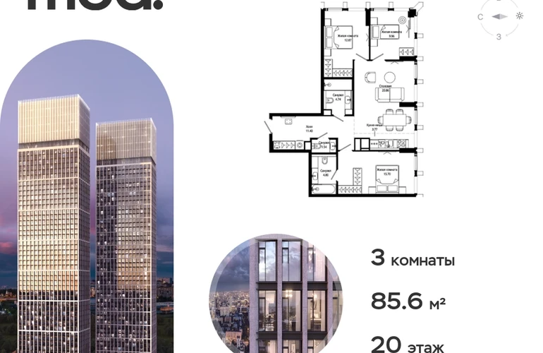 Прямая продажа от застройщика. Жилой комплекс премиум-класса Mod. Продается 3-к квартира общей площадью 85.64 кв. м с предчистовой отделкой в ЖК Mod на 20-м этаже 44 этажного дома. Mod - жилой комплекс премиум-класса в историческом районе Москвы Марьина Роща. Пятый корпус станет частью единого высотного ансамбля, который поднимается над столицей и очерчивает новый горизонт города. Расположение корпуса Mod.C отличается тем, что виды на юго-запад Москвы не ограничены существующей застройкой. Почти все главные доминанты столицы — как на ладони: от сталинских высоток до небоскрёбов делового центра. Любоваться достопримечательностями будет вдвойне приятнее через панорамные окна. Закрытая территория жилого комплекса, продуманное благоустройство, эксплуатируемые кровли стилобата, образовательный центр с детским садом создают приватное пространство для тихой семейной жизни, а городская площадь с фонтанами, ресторан, супермаркет, коммерческая инфраструктура на первых этажах привносят созвучную с ритмом города динамику. Преимущества проекта: • В шаговой доступности новый деловой кластер Москвы • Выразительная авторская архитектура • Единственные в Москве фасады башен из натурального камня • Панорамное остекление и высота потолков до 4,8 м • Квартиры и апартаменты с отделкой MR Base • Многоуровневое благоустройство с зонированием на закрытой территории • Многофункциональный образовательный детский центр с детским садом • Двухуровневый подземный паркинг Транспортная доступность: • 5 минут пешком до станции метро «Марьина роща» • 3 минуты до ТТК • 15 минут до Цветного бульвара Компания MR Group предлагает своим клиентам специальные условия приобретения квартир в рамках программ ипотечного кредитования от банков-партнеров.О застройщике