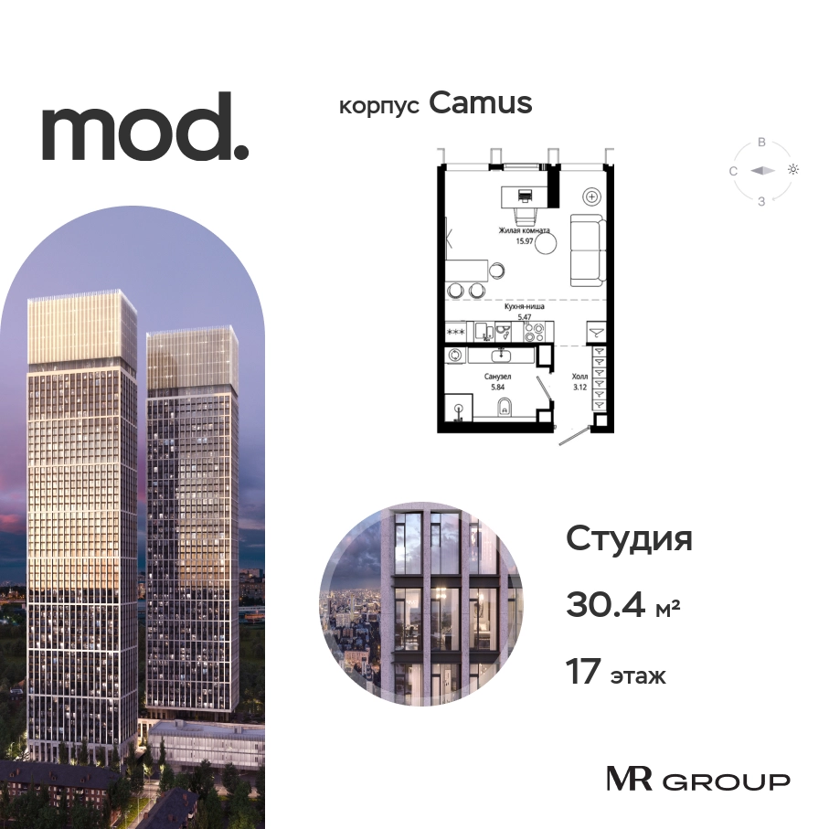 Прямая продажа от застройщика. Жилой комплекс премиум-класса Mod. Продается студия общей площадью 30.40 кв. м с предчистовой отделкой в ЖК Mod на 17-м этаже 44 этажного дома. Mod - жилой комплекс премиум-класса в историческом районе Москвы Марьина Роща. Пятый корпус станет частью единого высотного ансамбля, который поднимается над столицей и очерчивает новый горизонт города. Расположение корпуса Mod.C отличается тем, что виды на юго-запад Москвы не ограничены существующей застройкой. Почти все главные доминанты столицы — как на ладони: от сталинских высоток до небоскрёбов делового центра. Любоваться достопримечательностями будет вдвойне приятнее через панорамные окна. Закрытая территория жилого комплекса, продуманное благоустройство, эксплуатируемые кровли стилобата, образовательный центр с детским садом создают приватное пространство для тихой семейной жизни, а городская площадь с фонтанами, ресторан, супермаркет, коммерческая инфраструктура на первых этажах привносят созвучную с ритмом города динамику. Преимущества проекта: • В шаговой доступности новый деловой кластер Москвы • Выразительная авторская архитектура • Единственные в Москве фасады башен из натурального камня • Панорамное остекление и высота потолков до 4,8 м • Квартиры и апартаменты с отделкой MR Base • Многоуровневое благоустройство с зонированием на закрытой территории • Многофункциональный образовательный детский центр с детским садом • Двухуровневый подземный паркинг Транспортная доступность: • 5 минут пешком до станции метро «Марьина роща» • 3 минуты до ТТК • 15 минут до Цветного бульвара Компания MR Group предлагает своим клиентам специальные условия приобретения квартир в рамках программ ипотечного кредитования от банков-партнеров.О застройщике