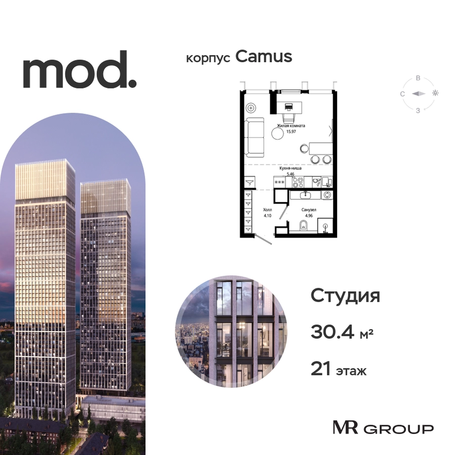 Прямая продажа от застройщика. Жилой комплекс премиум-класса Mod. Продается студия общей площадью 30.49 кв. м с предчистовой отделкой в ЖК Mod на 21-м этаже 44 этажного дома. Mod - жилой комплекс премиум-класса в историческом районе Москвы Марьина Роща. Пятый корпус станет частью единого высотного ансамбля, который поднимается над столицей и очерчивает новый горизонт города. Расположение корпуса Mod.C отличается тем, что виды на юго-запад Москвы не ограничены существующей застройкой. Почти все главные доминанты столицы — как на ладони: от сталинских высоток до небоскрёбов делового центра. Любоваться достопримечательностями будет вдвойне приятнее через панорамные окна. Закрытая территория жилого комплекса, продуманное благоустройство, эксплуатируемые кровли стилобата, образовательный центр с детским садом создают приватное пространство для тихой семейной жизни, а городская площадь с фонтанами, ресторан, супермаркет, коммерческая инфраструктура на первых этажах привносят созвучную с ритмом города динамику. Преимущества проекта: • В шаговой доступности новый деловой кластер Москвы • Выразительная авторская архитектура • Единственные в Москве фасады башен из натурального камня • Панорамное остекление и высота потолков до 4,8 м • Квартиры и апартаменты с отделкой MR Base • Многоуровневое благоустройство с зонированием на закрытой территории • Многофункциональный образовательный детский центр с детским садом • Двухуровневый подземный паркинг Транспортная доступность: • 5 минут пешком до станции метро «Марьина роща» • 3 минуты до ТТК • 15 минут до Цветного бульвара Компания MR Group предлагает своим клиентам специальные условия приобретения квартир в рамках программ ипотечного кредитования от банков-партнеров.О застройщике
