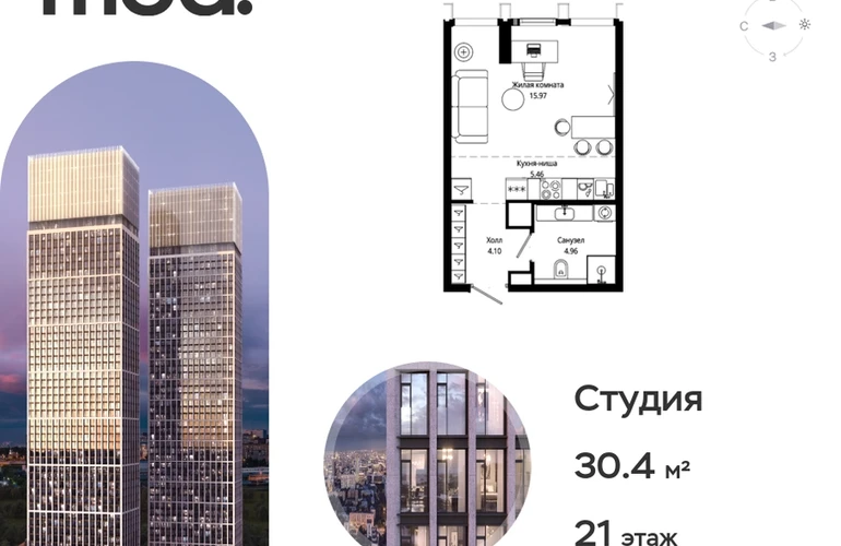 Прямая продажа от застройщика. Жилой комплекс премиум-класса Mod. Продается студия общей площадью 30.49 кв. м с предчистовой отделкой в ЖК Mod на 21-м этаже 44 этажного дома. Mod - жилой комплекс премиум-класса в историческом районе Москвы Марьина Роща. Пятый корпус станет частью единого высотного ансамбля, который поднимается над столицей и очерчивает новый горизонт города. Расположение корпуса Mod.C отличается тем, что виды на юго-запад Москвы не ограничены существующей застройкой. Почти все главные доминанты столицы — как на ладони: от сталинских высоток до небоскрёбов делового центра. Любоваться достопримечательностями будет вдвойне приятнее через панорамные окна. Закрытая территория жилого комплекса, продуманное благоустройство, эксплуатируемые кровли стилобата, образовательный центр с детским садом создают приватное пространство для тихой семейной жизни, а городская площадь с фонтанами, ресторан, супермаркет, коммерческая инфраструктура на первых этажах привносят созвучную с ритмом города динамику. Преимущества проекта: • В шаговой доступности новый деловой кластер Москвы • Выразительная авторская архитектура • Единственные в Москве фасады башен из натурального камня • Панорамное остекление и высота потолков до 4,8 м • Квартиры и апартаменты с отделкой MR Base • Многоуровневое благоустройство с зонированием на закрытой территории • Многофункциональный образовательный детский центр с детским садом • Двухуровневый подземный паркинг Транспортная доступность: • 5 минут пешком до станции метро «Марьина роща» • 3 минуты до ТТК • 15 минут до Цветного бульвара Компания MR Group предлагает своим клиентам специальные условия приобретения квартир в рамках программ ипотечного кредитования от банков-партнеров.О застройщике