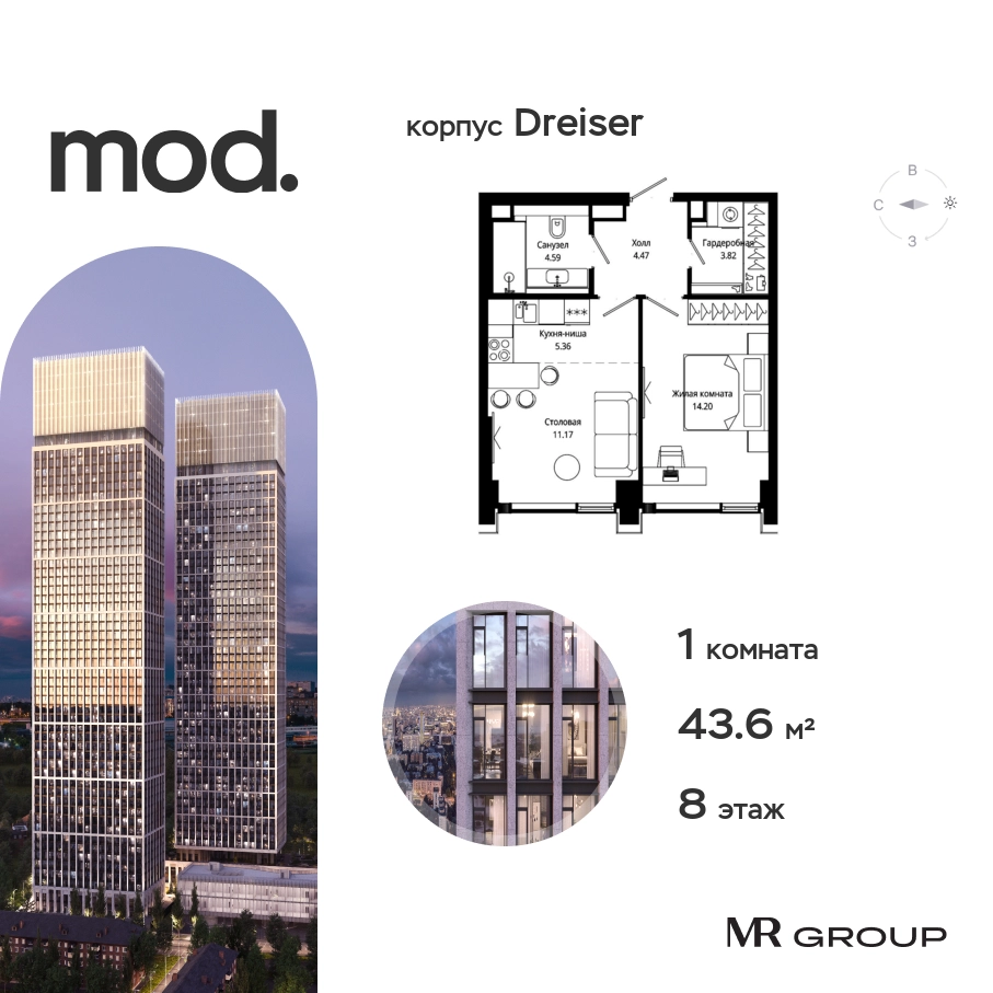 Прямая продажа от застройщика. Жилой комплекс премиум-класса Mod. Продается 1-к квартира общей площадью 43.61 кв. м с предчистовой отделкой в ЖК Mod на 8-м этаже 55 этажного дома. Mod - жилой комплекс премиум-класса в историческом районе Москвы Марьина Роща, состоящий из трех клубных домов (9 этажей) и трёх разноэтажных башен (44-55 этажей). Корпус Mod.D (55 этажей) назван именем знаменитого писателя модерниста Теодора Драйзера. 6 верхних этажей занимают пентхаусы с высотой потолков до 4,8 м. Отделка фасадов выполнена из натурального гранита, что является уникальным архитектурным решением. Чёткие линии тонкой монолитной башни увенчаны светящейся янтарной «короной», выполненной из стекла и ламелей из анодированного алюминия с подсветкой. Закрытая территория жилого комплекса, продуманное благоустройство, эксплуатируемые кровли стилобата, образовательный центр с детским садом создают приватное пространство для тихой семейной жизни, а городская площадь с фонтанами, ресторан, супермаркет, коммерческая инфраструктура на первых этажах привносят созвучную с ритмом города динамику. Преимущества проекта: • В шаговой доступности новый деловой кластер Москвы • Выразительная авторская архитектура • Единственные в Москве фасады башен из натурального камня • Панорамное остекление и высота потолков до 4,8 м • Квартиры и апартаменты с отделкой MR Base • Многоуровневое благоустройство с зонированием на закрытой территории • Многофункциональный образовательный детский центр с детским садом • Двухуровневый подземный паркинг Транспортная доступность: • 5 минут пешком до станции метро «Марьина роща» • 3 минуты до ТТК • 15 минут до Цветного бульвара Компания MR Group предлагает своим клиентам специальные условия приобретения квартир в рамках программ ипотечного кредитования от банков-партнеров.О застройщике
