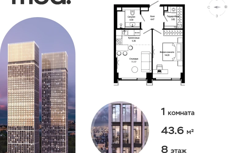 Прямая продажа от застройщика. Жилой комплекс премиум-класса Mod. Продается 1-к квартира общей площадью 43.61 кв. м с предчистовой отделкой в ЖК Mod на 8-м этаже 55 этажного дома. Mod - жилой комплекс премиум-класса в историческом районе Москвы Марьина Роща, состоящий из трех клубных домов (9 этажей) и трёх разноэтажных башен (44-55 этажей). Корпус Mod.D (55 этажей) назван именем знаменитого писателя модерниста Теодора Драйзера. 6 верхних этажей занимают пентхаусы с высотой потолков до 4,8 м. Отделка фасадов выполнена из натурального гранита, что является уникальным архитектурным решением. Чёткие линии тонкой монолитной башни увенчаны светящейся янтарной «короной», выполненной из стекла и ламелей из анодированного алюминия с подсветкой. Закрытая территория жилого комплекса, продуманное благоустройство, эксплуатируемые кровли стилобата, образовательный центр с детским садом создают приватное пространство для тихой семейной жизни, а городская площадь с фонтанами, ресторан, супермаркет, коммерческая инфраструктура на первых этажах привносят созвучную с ритмом города динамику. Преимущества проекта: • В шаговой доступности новый деловой кластер Москвы • Выразительная авторская архитектура • Единственные в Москве фасады башен из натурального камня • Панорамное остекление и высота потолков до 4,8 м • Квартиры и апартаменты с отделкой MR Base • Многоуровневое благоустройство с зонированием на закрытой территории • Многофункциональный образовательный детский центр с детским садом • Двухуровневый подземный паркинг Транспортная доступность: • 5 минут пешком до станции метро «Марьина роща» • 3 минуты до ТТК • 15 минут до Цветного бульвара Компания MR Group предлагает своим клиентам специальные условия приобретения квартир в рамках программ ипотечного кредитования от банков-партнеров.О застройщике