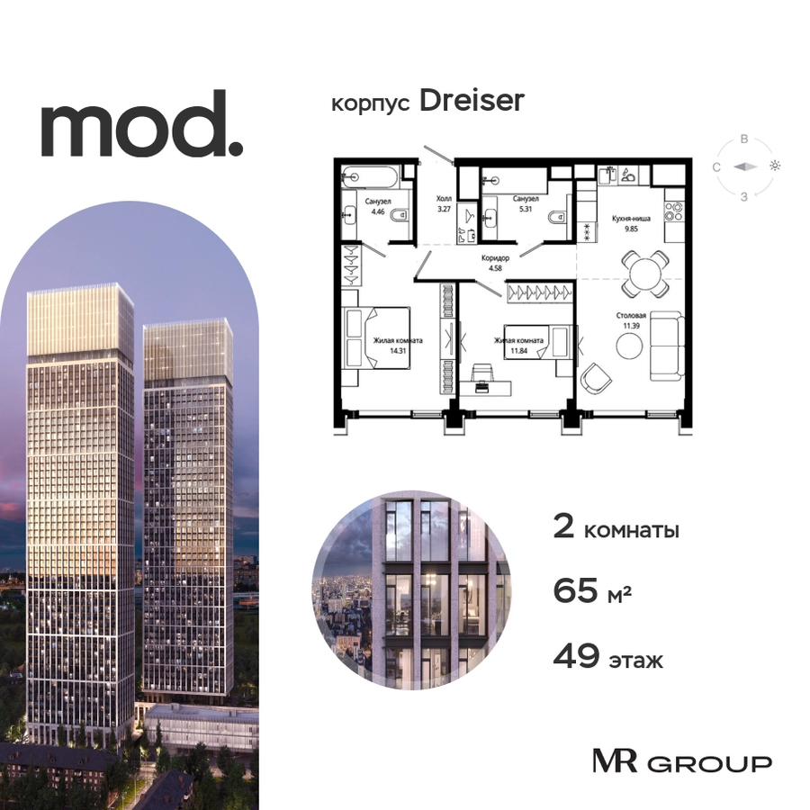 Прямая продажа от застройщика. Жилой комплекс премиум-класса Mod. Продается 2-к квартира общей площадью 65.01 кв. м с предчистовой отделкой в ЖК Mod на 49-м этаже 55 этажного дома. Mod - жилой комплекс премиум-класса в историческом районе Москвы Марьина Роща, состоящий из трех клубных домов (9 этажей) и трёх разноэтажных башен (44-55 этажей). Корпус Mod.D (55 этажей) назван именем знаменитого писателя модерниста Теодора Драйзера. 6 верхних этажей занимают пентхаусы с высотой потолков до 4,8 м. Отделка фасадов выполнена из натурального гранита, что является уникальным архитектурным решением. Чёткие линии тонкой монолитной башни увенчаны светящейся янтарной «короной», выполненной из стекла и ламелей из анодированного алюминия с подсветкой. Закрытая территория жилого комплекса, продуманное благоустройство, эксплуатируемые кровли стилобата, образовательный центр с детским садом создают приватное пространство для тихой семейной жизни, а городская площадь с фонтанами, ресторан, супермаркет, коммерческая инфраструктура на первых этажах привносят созвучную с ритмом города динамику. Преимущества проекта: • В шаговой доступности новый деловой кластер Москвы • Выразительная авторская архитектура • Единственные в Москве фасады башен из натурального камня • Панорамное остекление и высота потолков до 4,8 м • Квартиры и апартаменты с отделкой MR Base • Многоуровневое благоустройство с зонированием на закрытой территории • Многофункциональный образовательный детский центр с детским садом • Двухуровневый подземный паркинг Транспортная доступность: • 5 минут пешком до станции метро «Марьина роща» • 3 минуты до ТТК • 15 минут до Цветного бульвара Компания MR Group предлагает своим клиентам специальные условия приобретения квартир в рамках программ ипотечного кредитования от банков-партнеров.О застройщике