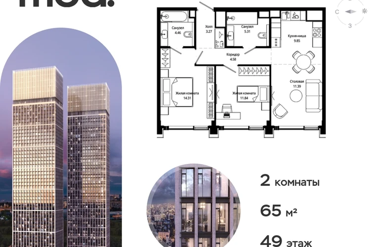 Прямая продажа от застройщика. Жилой комплекс премиум-класса Mod. Продается 2-к квартира общей площадью 65.01 кв. м с предчистовой отделкой в ЖК Mod на 49-м этаже 55 этажного дома. Mod - жилой комплекс премиум-класса в историческом районе Москвы Марьина Роща, состоящий из трех клубных домов (9 этажей) и трёх разноэтажных башен (44-55 этажей). Корпус Mod.D (55 этажей) назван именем знаменитого писателя модерниста Теодора Драйзера. 6 верхних этажей занимают пентхаусы с высотой потолков до 4,8 м. Отделка фасадов выполнена из натурального гранита, что является уникальным архитектурным решением. Чёткие линии тонкой монолитной башни увенчаны светящейся янтарной «короной», выполненной из стекла и ламелей из анодированного алюминия с подсветкой. Закрытая территория жилого комплекса, продуманное благоустройство, эксплуатируемые кровли стилобата, образовательный центр с детским садом создают приватное пространство для тихой семейной жизни, а городская площадь с фонтанами, ресторан, супермаркет, коммерческая инфраструктура на первых этажах привносят созвучную с ритмом города динамику. Преимущества проекта: • В шаговой доступности новый деловой кластер Москвы • Выразительная авторская архитектура • Единственные в Москве фасады башен из натурального камня • Панорамное остекление и высота потолков до 4,8 м • Квартиры и апартаменты с отделкой MR Base • Многоуровневое благоустройство с зонированием на закрытой территории • Многофункциональный образовательный детский центр с детским садом • Двухуровневый подземный паркинг Транспортная доступность: • 5 минут пешком до станции метро «Марьина роща» • 3 минуты до ТТК • 15 минут до Цветного бульвара Компания MR Group предлагает своим клиентам специальные условия приобретения квартир в рамках программ ипотечного кредитования от банков-партнеров.О застройщике