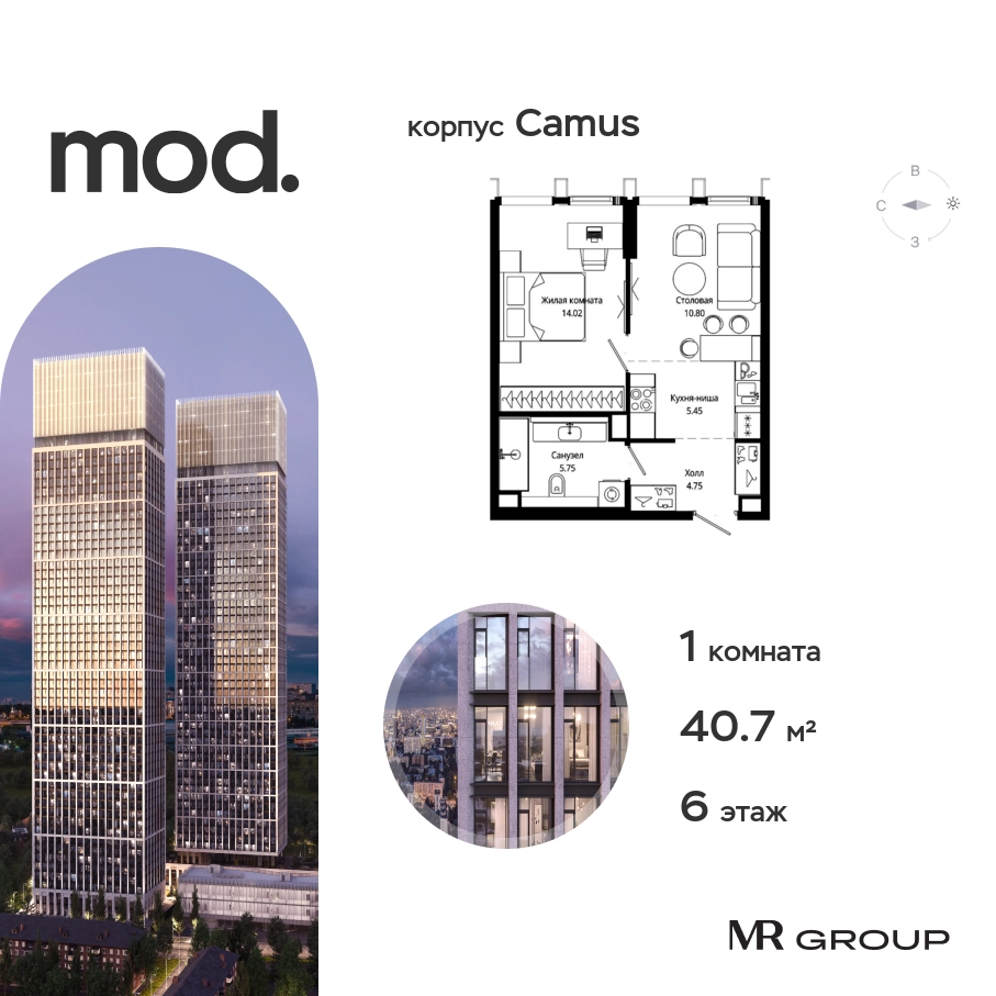 Прямая продажа от застройщика. Жилой комплекс премиум-класса Mod. Продается 1-к квартира общей площадью 40.77 кв. м с предчистовой отделкой в ЖК Mod на 6-м этаже 44 этажного дома. Mod - жилой комплекс премиум-класса в историческом районе Москвы Марьина Роща. Пятый корпус станет частью единого высотного ансамбля, который поднимается над столицей и очерчивает новый горизонт города. Расположение корпуса Mod.C отличается тем, что виды на юго-запад Москвы не ограничены существующей застройкой. Почти все главные доминанты столицы — как на ладони: от сталинских высоток до небоскрёбов делового центра. Любоваться достопримечательностями будет вдвойне приятнее через панорамные окна. Закрытая территория жилого комплекса, продуманное благоустройство, эксплуатируемые кровли стилобата, образовательный центр с детским садом создают приватное пространство для тихой семейной жизни, а городская площадь с фонтанами, ресторан, супермаркет, коммерческая инфраструктура на первых этажах привносят созвучную с ритмом города динамику. Преимущества проекта: • В шаговой доступности новый деловой кластер Москвы • Выразительная авторская архитектура • Единственные в Москве фасады башен из натурального камня • Панорамное остекление и высота потолков до 4,8 м • Квартиры и апартаменты с отделкой MR Base • Многоуровневое благоустройство с зонированием на закрытой территории • Многофункциональный образовательный детский центр с детским садом • Двухуровневый подземный паркинг Транспортная доступность: • 5 минут пешком до станции метро «Марьина роща» • 3 минуты до ТТК • 15 минут до Цветного бульвара Компания MR Group предлагает своим клиентам специальные условия приобретения квартир в рамках программ ипотечного кредитования от банков-партнеров.О застройщике