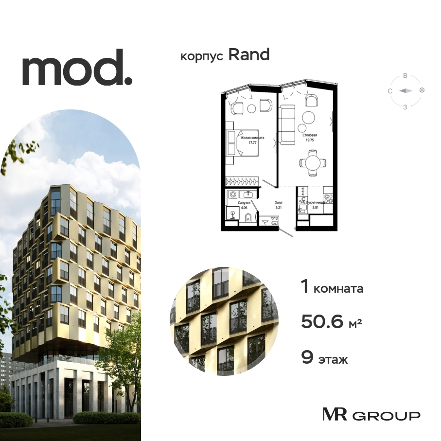 Прямая продажа жилого комплекса премиум-класса от застройщика. Продается 1-к квартира общей площадью 50.60 кв. м с чистовой отделкой в ЖК Mod на 9-м этаже 9 этажного дома. Mod - жилой комплекс премиум-класса в историческом районе Москвы Марьина Роща, состоящий из трех клубных домов (9 этажей) и трёх разноэтажных башен (44-55 этажей). Закрытая территория жилого комплекса, продуманное благоустройство, эксплуатируемые кровли стилобата, образовательный центр с детским садом создают приватное пространство для тихой семейной жизни, а городская площадь с фонтанами, ресторан, супермаркет, коммерческая инфраструктура на первых этажах привносят созвучную с ритмом города динамику. Преимущества проекта: • В шаговой доступности новый деловой кластер Москвы • Выразительная авторская архитектура • Единственные в Москве фасады башен из натурального камня • Панорамное остекление и высота потолков до 4,8 м • Квартиры и апартаменты с отделкой MR Base • Многоуровневое благоустройство с зонированием на закрытой территории • Многофункциональный образовательный детский центр с детским садом • Двухуровневый подземный паркинг Транспортная доступность: • 5 минут пешком до станции метро «Марьина роща» • 3 минуты до ТТК • 15 минут до Цветного бульвара Компания MR Group предлагает своим клиентам специальные условия приобретения квартир в рамках программ ипотечного кредитования от банков-партнеров.О застройщике