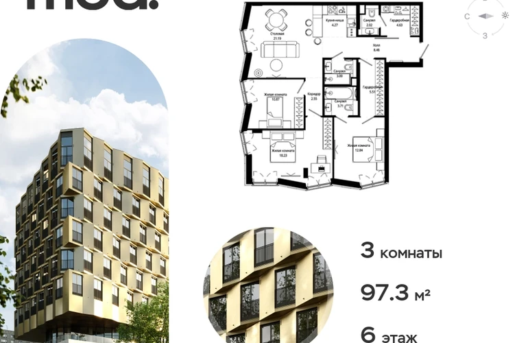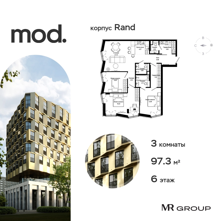 Прямая продажа жилого комплекса премиум-класса от застройщика. Продается 3-к квартира общей площадью 97.30 кв. м с чистовой отделкой в ЖК Mod на 6-м этаже 9 этажного дома. Mod - жилой комплекс премиум-класса в историческом районе Москвы Марьина Роща, состоящий из трех клубных домов (9 этажей) и трёх разноэтажных башен (44-55 этажей). Закрытая территория жилого комплекса, продуманное благоустройство, эксплуатируемые кровли стилобата, образовательный центр с детским садом создают приватное пространство для тихой семейной жизни, а городская площадь с фонтанами, ресторан, супермаркет, коммерческая инфраструктура на первых этажах привносят созвучную с ритмом города динамику. Преимущества проекта: • В шаговой доступности новый деловой кластер Москвы • Выразительная авторская архитектура • Единственные в Москве фасады башен из натурального камня • Панорамное остекление и высота потолков до 4,8 м • Квартиры и апартаменты с отделкой MR Base • Многоуровневое благоустройство с зонированием на закрытой территории • Многофункциональный образовательный детский центр с детским садом • Двухуровневый подземный паркинг Транспортная доступность: • 5 минут пешком до станции метро «Марьина роща» • 3 минуты до ТТК • 15 минут до Цветного бульвара Компания MR Group предлагает своим клиентам специальные условия приобретения квартир в рамках программ ипотечного кредитования от банков-партнеров.О застройщике