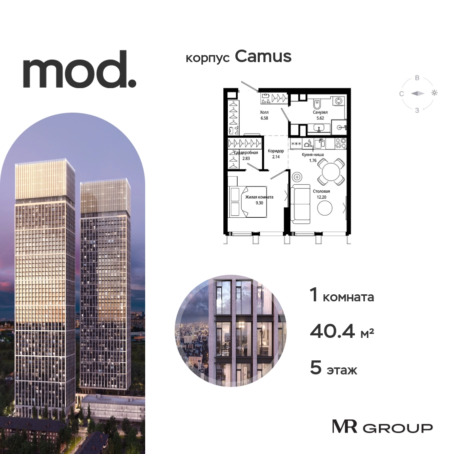 Прямая продажа от застройщика. Жилой комплекс премиум-класса Mod. Продается 1-к квартира общей площадью 40.43 кв. м с предчистовой отделкой в ЖК Mod на 5-м этаже 44 этажного дома. Mod - жилой комплекс премиум-класса в историческом районе Москвы Марьина Роща. Пятый корпус станет частью единого высотного ансамбля, который поднимается над столицей и очерчивает новый горизонт города. Расположение корпуса Mod.C отличается тем, что виды на юго-запад Москвы не ограничены существующей застройкой. Почти все главные доминанты столицы — как на ладони: от сталинских высоток до небоскрёбов делового центра. Любоваться достопримечательностями будет вдвойне приятнее через панорамные окна. Закрытая территория жилого комплекса, продуманное благоустройство, эксплуатируемые кровли стилобата, образовательный центр с детским садом создают приватное пространство для тихой семейной жизни, а городская площадь с фонтанами, ресторан, супермаркет, коммерческая инфраструктура на первых этажах привносят созвучную с ритмом города динамику. Преимущества проекта: • В шаговой доступности новый деловой кластер Москвы • Выразительная авторская архитектура • Единственные в Москве фасады башен из натурального камня • Панорамное остекление и высота потолков до 4,8 м • Квартиры и апартаменты с отделкой MR Base • Многоуровневое благоустройство с зонированием на закрытой территории • Многофункциональный образовательный детский центр с детским садом • Двухуровневый подземный паркинг Транспортная доступность: • 5 минут пешком до станции метро «Марьина роща» • 3 минуты до ТТК • 15 минут до Цветного бульвара Компания MR Group предлагает своим клиентам специальные условия приобретения квартир в рамках программ ипотечного кредитования от банков-партнеров.О застройщике