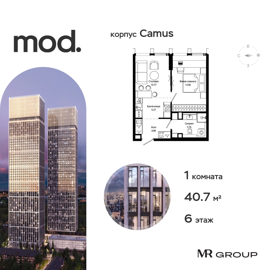 Прямая продажа от застройщика. Жилой комплекс премиум-класса Mod. Продается 1-к квартира общей площадью 40.74 кв. м с предчистовой отделкой в ЖК Mod на 6-м этаже 44 этажного дома. Mod - жилой комплекс премиум-класса в историческом районе Москвы Марьина Роща. Пятый корпус станет частью единого высотного ансамбля, который поднимается над столицей и очерчивает новый горизонт города. Расположение корпуса Mod.C отличается тем, что виды на юго-запад Москвы не ограничены существующей застройкой. Почти все главные доминанты столицы — как на ладони: от сталинских высоток до небоскрёбов делового центра. Любоваться достопримечательностями будет вдвойне приятнее через панорамные окна. Закрытая территория жилого комплекса, продуманное благоустройство, эксплуатируемые кровли стилобата, образовательный центр с детским садом создают приватное пространство для тихой семейной жизни, а городская площадь с фонтанами, ресторан, супермаркет, коммерческая инфраструктура на первых этажах привносят созвучную с ритмом города динамику. Преимущества проекта: • В шаговой доступности новый деловой кластер Москвы • Выразительная авторская архитектура • Единственные в Москве фасады башен из натурального камня • Панорамное остекление и высота потолков до 4,8 м • Квартиры и апартаменты с отделкой MR Base • Многоуровневое благоустройство с зонированием на закрытой территории • Многофункциональный образовательный детский центр с детским садом • Двухуровневый подземный паркинг Транспортная доступность: • 5 минут пешком до станции метро «Марьина роща» • 3 минуты до ТТК • 15 минут до Цветного бульвара Компания MR Group предлагает своим клиентам специальные условия приобретения квартир в рамках программ ипотечного кредитования от банков-партнеров.О застройщике