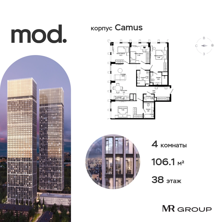 Прямая продажа от застройщика. Жилой комплекс премиум-класса Mod. Продается 4-к квартира общей площадью 106.18 кв. м с предчистовой отделкой в ЖК Mod на 38-м этаже 44 этажного дома. Mod - жилой комплекс премиум-класса в историческом районе Москвы Марьина Роща. Пятый корпус станет частью единого высотного ансамбля, который поднимается над столицей и очерчивает новый горизонт города. Расположение корпуса Mod.C отличается тем, что виды на юго-запад Москвы не ограничены существующей застройкой. Почти все главные доминанты столицы — как на ладони: от сталинских высоток до небоскрёбов делового центра. Любоваться достопримечательностями будет вдвойне приятнее через панорамные окна. Закрытая территория жилого комплекса, продуманное благоустройство, эксплуатируемые кровли стилобата, образовательный центр с детским садом создают приватное пространство для тихой семейной жизни, а городская площадь с фонтанами, ресторан, супермаркет, коммерческая инфраструктура на первых этажах привносят созвучную с ритмом города динамику. Преимущества проекта: • В шаговой доступности новый деловой кластер Москвы • Выразительная авторская архитектура • Единственные в Москве фасады башен из натурального камня • Панорамное остекление и высота потолков до 4,8 м • Квартиры и апартаменты с отделкой MR Base • Многоуровневое благоустройство с зонированием на закрытой территории • Многофункциональный образовательный детский центр с детским садом • Двухуровневый подземный паркинг Транспортная доступность: • 5 минут пешком до станции метро «Марьина роща» • 3 минуты до ТТК • 15 минут до Цветного бульвара Компания MR Group предлагает своим клиентам специальные условия приобретения квартир в рамках программ ипотечного кредитования от банков-партнеров.О застройщике