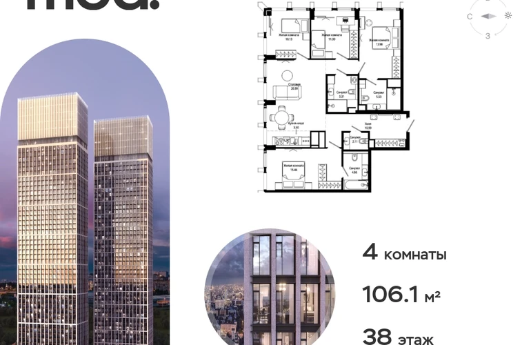 Прямая продажа от застройщика. Жилой комплекс премиум-класса Mod. Продается 4-к квартира общей площадью 106.18 кв. м с предчистовой отделкой в ЖК Mod на 38-м этаже 44 этажного дома. Mod - жилой комплекс премиум-класса в историческом районе Москвы Марьина Роща. Пятый корпус станет частью единого высотного ансамбля, который поднимается над столицей и очерчивает новый горизонт города. Расположение корпуса Mod.C отличается тем, что виды на юго-запад Москвы не ограничены существующей застройкой. Почти все главные доминанты столицы — как на ладони: от сталинских высоток до небоскрёбов делового центра. Любоваться достопримечательностями будет вдвойне приятнее через панорамные окна. Закрытая территория жилого комплекса, продуманное благоустройство, эксплуатируемые кровли стилобата, образовательный центр с детским садом создают приватное пространство для тихой семейной жизни, а городская площадь с фонтанами, ресторан, супермаркет, коммерческая инфраструктура на первых этажах привносят созвучную с ритмом города динамику. Преимущества проекта: • В шаговой доступности новый деловой кластер Москвы • Выразительная авторская архитектура • Единственные в Москве фасады башен из натурального камня • Панорамное остекление и высота потолков до 4,8 м • Квартиры и апартаменты с отделкой MR Base • Многоуровневое благоустройство с зонированием на закрытой территории • Многофункциональный образовательный детский центр с детским садом • Двухуровневый подземный паркинг Транспортная доступность: • 5 минут пешком до станции метро «Марьина роща» • 3 минуты до ТТК • 15 минут до Цветного бульвара Компания MR Group предлагает своим клиентам специальные условия приобретения квартир в рамках программ ипотечного кредитования от банков-партнеров.О застройщике
