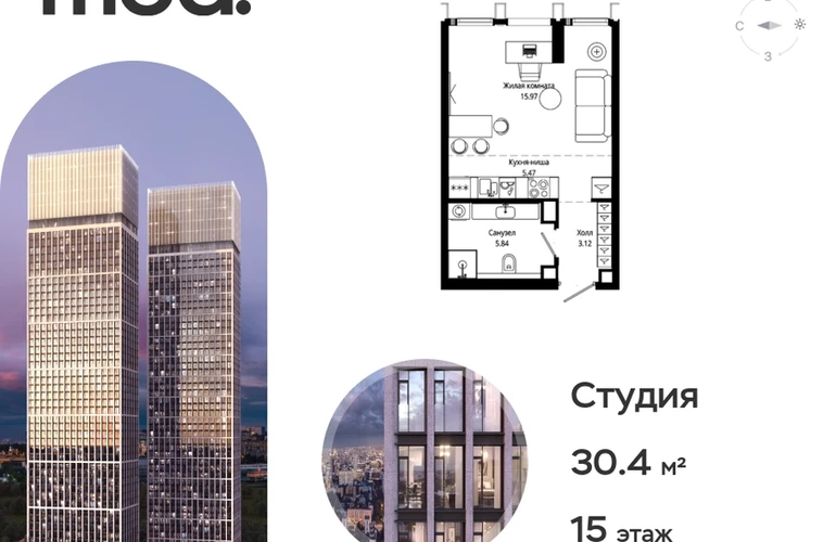 Прямая продажа от застройщика. Жилой комплекс премиум-класса Mod. Продается студия общей площадью 30.40 кв. м с предчистовой отделкой в ЖК Mod на 15-м этаже 44 этажного дома. Mod - жилой комплекс премиум-класса в историческом районе Москвы Марьина Роща. Пятый корпус станет частью единого высотного ансамбля, который поднимается над столицей и очерчивает новый горизонт города. Расположение корпуса Mod.C отличается тем, что виды на юго-запад Москвы не ограничены существующей застройкой. Почти все главные доминанты столицы — как на ладони: от сталинских высоток до небоскрёбов делового центра. Любоваться достопримечательностями будет вдвойне приятнее через панорамные окна. Закрытая территория жилого комплекса, продуманное благоустройство, эксплуатируемые кровли стилобата, образовательный центр с детским садом создают приватное пространство для тихой семейной жизни, а городская площадь с фонтанами, ресторан, супермаркет, коммерческая инфраструктура на первых этажах привносят созвучную с ритмом города динамику. Преимущества проекта: • В шаговой доступности новый деловой кластер Москвы • Выразительная авторская архитектура • Единственные в Москве фасады башен из натурального камня • Панорамное остекление и высота потолков до 4,8 м • Квартиры и апартаменты с отделкой MR Base • Многоуровневое благоустройство с зонированием на закрытой территории • Многофункциональный образовательный детский центр с детским садом • Двухуровневый подземный паркинг Транспортная доступность: • 5 минут пешком до станции метро «Марьина роща» • 3 минуты до ТТК • 15 минут до Цветного бульвара Компания MR Group предлагает своим клиентам специальные условия приобретения квартир в рамках программ ипотечного кредитования от банков-партнеров.О застройщике
