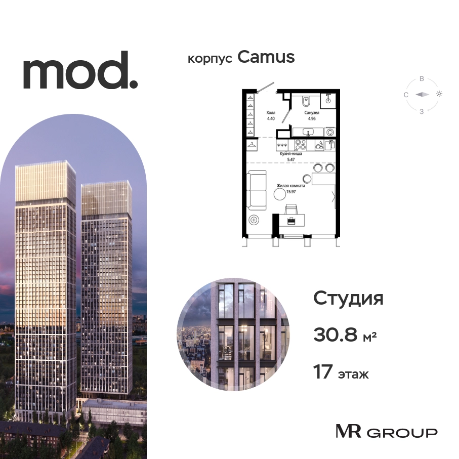 Прямая продажа от застройщика. Жилой комплекс премиум-класса Mod. Продается студия общей площадью 30.80 кв. м с предчистовой отделкой в ЖК Mod на 17-м этаже 44 этажного дома. Mod - жилой комплекс премиум-класса в историческом районе Москвы Марьина Роща. Пятый корпус станет частью единого высотного ансамбля, который поднимается над столицей и очерчивает новый горизонт города. Расположение корпуса Mod.C отличается тем, что виды на юго-запад Москвы не ограничены существующей застройкой. Почти все главные доминанты столицы — как на ладони: от сталинских высоток до небоскрёбов делового центра. Любоваться достопримечательностями будет вдвойне приятнее через панорамные окна. Закрытая территория жилого комплекса, продуманное благоустройство, эксплуатируемые кровли стилобата, образовательный центр с детским садом создают приватное пространство для тихой семейной жизни, а городская площадь с фонтанами, ресторан, супермаркет, коммерческая инфраструктура на первых этажах привносят созвучную с ритмом города динамику. Преимущества проекта: • В шаговой доступности новый деловой кластер Москвы • Выразительная авторская архитектура • Единственные в Москве фасады башен из натурального камня • Панорамное остекление и высота потолков до 4,8 м • Квартиры и апартаменты с отделкой MR Base • Многоуровневое благоустройство с зонированием на закрытой территории • Многофункциональный образовательный детский центр с детским садом • Двухуровневый подземный паркинг Транспортная доступность: • 5 минут пешком до станции метро «Марьина роща» • 3 минуты до ТТК • 15 минут до Цветного бульвара Компания MR Group предлагает своим клиентам специальные условия приобретения квартир в рамках программ ипотечного кредитования от банков-партнеров.О застройщике