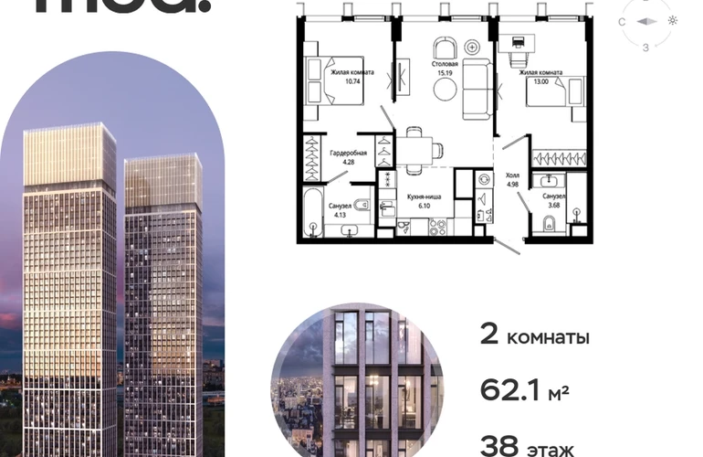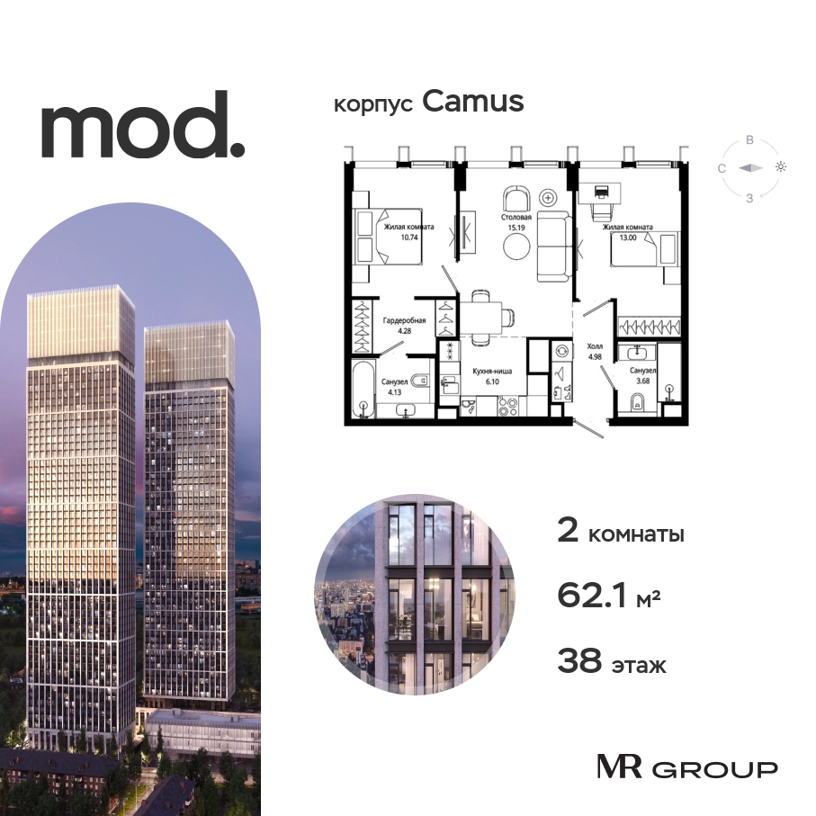 Прямая продажа от застройщика. Жилой комплекс премиум-класса Mod. Продается 2-к квартира общей площадью 62.10 кв. м с предчистовой отделкой в ЖК Mod на 38-м этаже 44 этажного дома. Mod - жилой комплекс премиум-класса в историческом районе Москвы Марьина Роща. Пятый корпус станет частью единого высотного ансамбля, который поднимается над столицей и очерчивает новый горизонт города. Расположение корпуса Mod.C отличается тем, что виды на юго-запад Москвы не ограничены существующей застройкой. Почти все главные доминанты столицы — как на ладони: от сталинских высоток до небоскрёбов делового центра. Любоваться достопримечательностями будет вдвойне приятнее через панорамные окна. Закрытая территория жилого комплекса, продуманное благоустройство, эксплуатируемые кровли стилобата, образовательный центр с детским садом создают приватное пространство для тихой семейной жизни, а городская площадь с фонтанами, ресторан, супермаркет, коммерческая инфраструктура на первых этажах привносят созвучную с ритмом города динамику. Преимущества проекта: • В шаговой доступности новый деловой кластер Москвы • Выразительная авторская архитектура • Единственные в Москве фасады башен из натурального камня • Панорамное остекление и высота потолков до 4,8 м • Квартиры и апартаменты с отделкой MR Base • Многоуровневое благоустройство с зонированием на закрытой территории • Многофункциональный образовательный детский центр с детским садом • Двухуровневый подземный паркинг Транспортная доступность: • 5 минут пешком до станции метро «Марьина роща» • 3 минуты до ТТК • 15 минут до Цветного бульвара Компания MR Group предлагает своим клиентам специальные условия приобретения квартир в рамках программ ипотечного кредитования от банков-партнеров.О застройщике