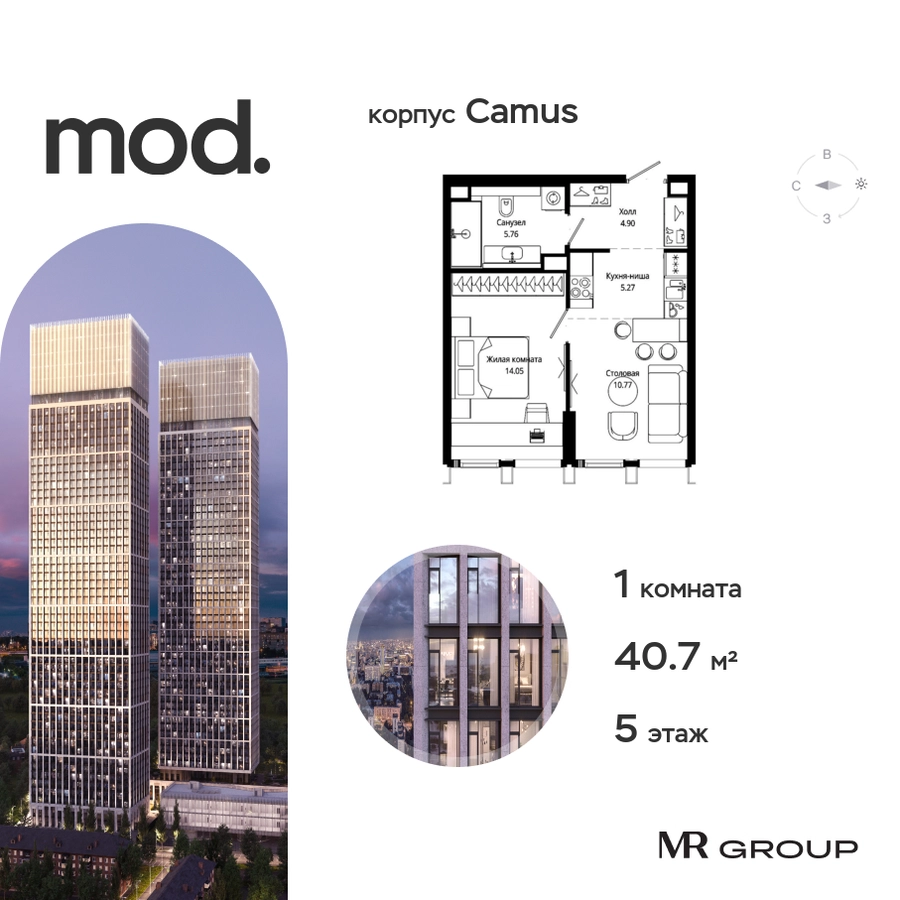 Прямая продажа от застройщика. Жилой комплекс премиум-класса Mod. Продается 1-к квартира общей площадью 40.68 кв. м с предчистовой отделкой в ЖК Mod на 5-м этаже 44 этажного дома. Mod - жилой комплекс премиум-класса в историческом районе Москвы Марьина Роща. Пятый корпус станет частью единого высотного ансамбля, который поднимается над столицей и очерчивает новый горизонт города. Расположение корпуса Mod.C отличается тем, что виды на юго-запад Москвы не ограничены существующей застройкой. Почти все главные доминанты столицы — как на ладони: от сталинских высоток до небоскрёбов делового центра. Любоваться достопримечательностями будет вдвойне приятнее через панорамные окна. Закрытая территория жилого комплекса, продуманное благоустройство, эксплуатируемые кровли стилобата, образовательный центр с детским садом создают приватное пространство для тихой семейной жизни, а городская площадь с фонтанами, ресторан, супермаркет, коммерческая инфраструктура на первых этажах привносят созвучную с ритмом города динамику. Преимущества проекта: • В шаговой доступности новый деловой кластер Москвы • Выразительная авторская архитектура • Единственные в Москве фасады башен из натурального камня • Панорамное остекление и высота потолков до 4,8 м • Квартиры и апартаменты с отделкой MR Base • Многоуровневое благоустройство с зонированием на закрытой территории • Многофункциональный образовательный детский центр с детским садом • Двухуровневый подземный паркинг Транспортная доступность: • 5 минут пешком до станции метро «Марьина роща» • 3 минуты до ТТК • 15 минут до Цветного бульвара Компания MR Group предлагает своим клиентам специальные условия приобретения квартир в рамках программ ипотечного кредитования от банков-партнеров.О застройщике