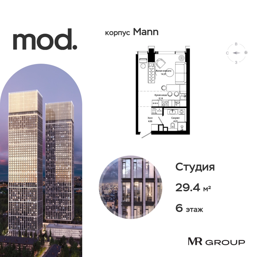Прямая продажа от застройщика. Жилой комплекс премиум-класса Mod. Продается студия общей площадью 29.40 кв. м с предчистовой отделкой в ЖК Mod на 6-м этаже 55 этажного дома. Mod - жилой комплекс премиум-класса в историческом районе Москвы Марьина Роща, состоящий из трех клубных домов (9 этажей) и трёх разноэтажных башен (44-55 этажей). Корпус Mod.M (55 этажей). Отделка фасадов выполнена из натурального гранита, что является уникальным архитектурным решением. Чёткие линии тонкой монолитной башни увенчаны светящейся янтарной «короной», выполненной из стекла и ламелей из анодированного алюминия с подсветкой. Закрытая территория жилого комплекса, продуманное благоустройство, эксплуатируемые кровли стилобата, образовательный центр с детским садом создают приватное пространство для тихой семейной жизни, а городская площадь с фонтанами, ресторан, супермаркет, коммерческая инфраструктура на первых этажах привносят созвучную с ритмом города динамику. Преимущества проекта: • В шаговой доступности новый деловой кластер Москвы • Выразительная авторская архитектура • Единственные в Москве фасады башен из натурального камня • Панорамное остекление и высота потолков до 4,8 м • Квартиры и апартаменты с отделкой MR Base • Многоуровневое благоустройство с зонированием на закрытой территории • Многофункциональный образовательный детский центр с детским садом • Двухуровневый подземный паркинг Транспортная доступность: • 5 минут пешком до станции метро «Марьина роща» • 3 минуты до ТТК • 15 минут до Цветного бульвара Компания MR Group предлагает своим клиентам специальные условия приобретения квартир в рамках программ ипотечного кредитования от банков-партнеров.О застройщике