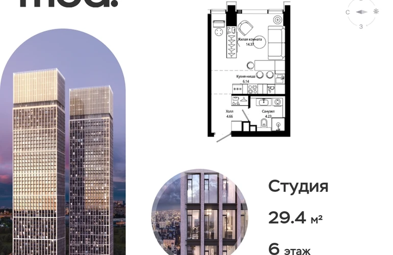 Прямая продажа от застройщика. Жилой комплекс премиум-класса Mod. Продается студия общей площадью 29.40 кв. м с предчистовой отделкой в ЖК Mod на 6-м этаже 55 этажного дома. Mod - жилой комплекс премиум-класса в историческом районе Москвы Марьина Роща, состоящий из трех клубных домов (9 этажей) и трёх разноэтажных башен (44-55 этажей). Корпус Mod.M (55 этажей). Отделка фасадов выполнена из натурального гранита, что является уникальным архитектурным решением. Чёткие линии тонкой монолитной башни увенчаны светящейся янтарной «короной», выполненной из стекла и ламелей из анодированного алюминия с подсветкой. Закрытая территория жилого комплекса, продуманное благоустройство, эксплуатируемые кровли стилобата, образовательный центр с детским садом создают приватное пространство для тихой семейной жизни, а городская площадь с фонтанами, ресторан, супермаркет, коммерческая инфраструктура на первых этажах привносят созвучную с ритмом города динамику. Преимущества проекта: • В шаговой доступности новый деловой кластер Москвы • Выразительная авторская архитектура • Единственные в Москве фасады башен из натурального камня • Панорамное остекление и высота потолков до 4,8 м • Квартиры и апартаменты с отделкой MR Base • Многоуровневое благоустройство с зонированием на закрытой территории • Многофункциональный образовательный детский центр с детским садом • Двухуровневый подземный паркинг Транспортная доступность: • 5 минут пешком до станции метро «Марьина роща» • 3 минуты до ТТК • 15 минут до Цветного бульвара Компания MR Group предлагает своим клиентам специальные условия приобретения квартир в рамках программ ипотечного кредитования от банков-партнеров.О застройщике