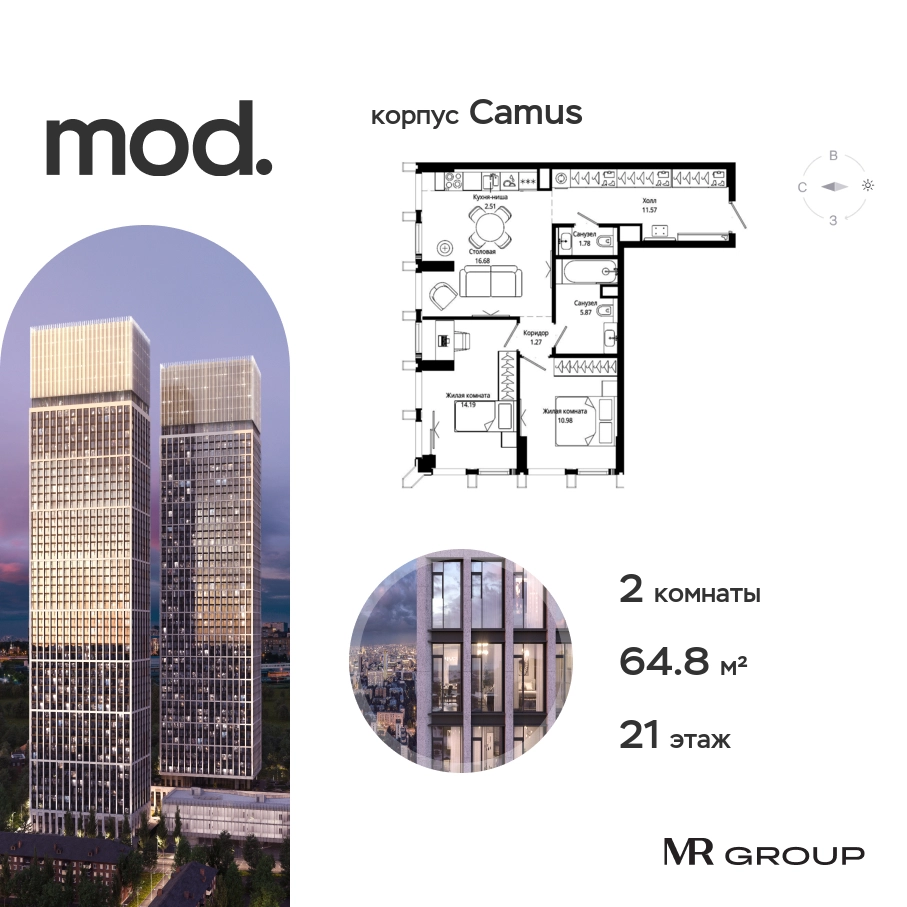 Прямая продажа от застройщика. Жилой комплекс премиум-класса Mod. Продается 2-к квартира общей площадью 64.85 кв. м с предчистовой отделкой в ЖК Mod на 21-м этаже 44 этажного дома. Mod - жилой комплекс премиум-класса в историческом районе Москвы Марьина Роща. Пятый корпус станет частью единого высотного ансамбля, который поднимается над столицей и очерчивает новый горизонт города. Расположение корпуса Mod.C отличается тем, что виды на юго-запад Москвы не ограничены существующей застройкой. Почти все главные доминанты столицы — как на ладони: от сталинских высоток до небоскрёбов делового центра. Любоваться достопримечательностями будет вдвойне приятнее через панорамные окна. Закрытая территория жилого комплекса, продуманное благоустройство, эксплуатируемые кровли стилобата, образовательный центр с детским садом создают приватное пространство для тихой семейной жизни, а городская площадь с фонтанами, ресторан, супермаркет, коммерческая инфраструктура на первых этажах привносят созвучную с ритмом города динамику. Преимущества проекта: • В шаговой доступности новый деловой кластер Москвы • Выразительная авторская архитектура • Единственные в Москве фасады башен из натурального камня • Панорамное остекление и высота потолков до 4,8 м • Квартиры и апартаменты с отделкой MR Base • Многоуровневое благоустройство с зонированием на закрытой территории • Многофункциональный образовательный детский центр с детским садом • Двухуровневый подземный паркинг Транспортная доступность: • 5 минут пешком до станции метро «Марьина роща» • 3 минуты до ТТК • 15 минут до Цветного бульвара Компания MR Group предлагает своим клиентам специальные условия приобретения квартир в рамках программ ипотечного кредитования от банков-партнеров.О застройщике