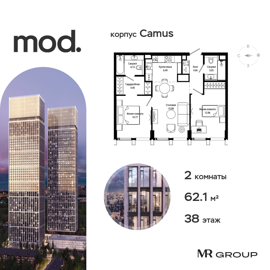 Прямая продажа от застройщика. Жилой комплекс премиум-класса Mod. Продается 2-к квартира общей площадью 62.14 кв. м с предчистовой отделкой в ЖК Mod на 38-м этаже 44 этажного дома. Mod - жилой комплекс премиум-класса в историческом районе Москвы Марьина Роща. Пятый корпус станет частью единого высотного ансамбля, который поднимается над столицей и очерчивает новый горизонт города. Расположение корпуса Mod.C отличается тем, что виды на юго-запад Москвы не ограничены существующей застройкой. Почти все главные доминанты столицы — как на ладони: от сталинских высоток до небоскрёбов делового центра. Любоваться достопримечательностями будет вдвойне приятнее через панорамные окна. Закрытая территория жилого комплекса, продуманное благоустройство, эксплуатируемые кровли стилобата, образовательный центр с детским садом создают приватное пространство для тихой семейной жизни, а городская площадь с фонтанами, ресторан, супермаркет, коммерческая инфраструктура на первых этажах привносят созвучную с ритмом города динамику. Преимущества проекта: • В шаговой доступности новый деловой кластер Москвы • Выразительная авторская архитектура • Единственные в Москве фасады башен из натурального камня • Панорамное остекление и высота потолков до 4,8 м • Квартиры и апартаменты с отделкой MR Base • Многоуровневое благоустройство с зонированием на закрытой территории • Многофункциональный образовательный детский центр с детским садом • Двухуровневый подземный паркинг Транспортная доступность: • 5 минут пешком до станции метро «Марьина роща» • 3 минуты до ТТК • 15 минут до Цветного бульвара Компания MR Group предлагает своим клиентам специальные условия приобретения квартир в рамках программ ипотечного кредитования от банков-партнеров.О застройщике