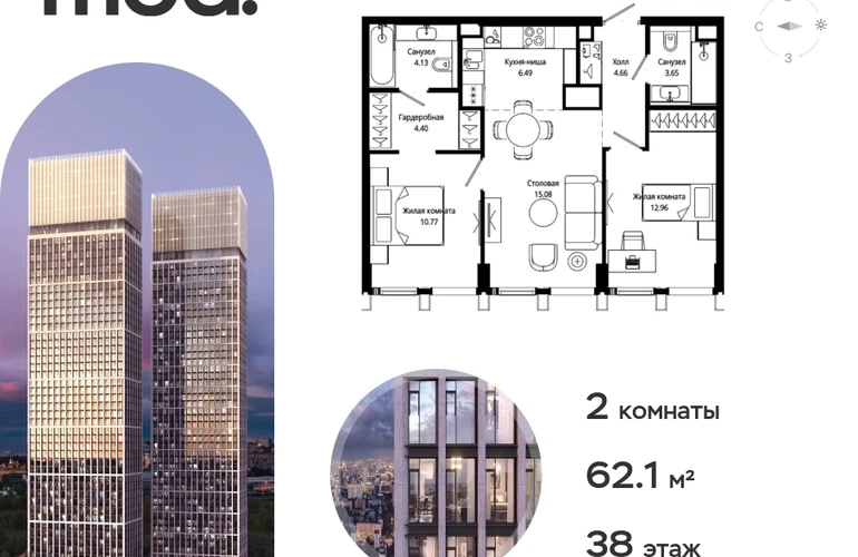 Прямая продажа от застройщика. Жилой комплекс премиум-класса Mod. Продается 2-к квартира общей площадью 62.14 кв. м с предчистовой отделкой в ЖК Mod на 38-м этаже 44 этажного дома. Mod - жилой комплекс премиум-класса в историческом районе Москвы Марьина Роща. Пятый корпус станет частью единого высотного ансамбля, который поднимается над столицей и очерчивает новый горизонт города. Расположение корпуса Mod.C отличается тем, что виды на юго-запад Москвы не ограничены существующей застройкой. Почти все главные доминанты столицы — как на ладони: от сталинских высоток до небоскрёбов делового центра. Любоваться достопримечательностями будет вдвойне приятнее через панорамные окна. Закрытая территория жилого комплекса, продуманное благоустройство, эксплуатируемые кровли стилобата, образовательный центр с детским садом создают приватное пространство для тихой семейной жизни, а городская площадь с фонтанами, ресторан, супермаркет, коммерческая инфраструктура на первых этажах привносят созвучную с ритмом города динамику. Преимущества проекта: • В шаговой доступности новый деловой кластер Москвы • Выразительная авторская архитектура • Единственные в Москве фасады башен из натурального камня • Панорамное остекление и высота потолков до 4,8 м • Квартиры и апартаменты с отделкой MR Base • Многоуровневое благоустройство с зонированием на закрытой территории • Многофункциональный образовательный детский центр с детским садом • Двухуровневый подземный паркинг Транспортная доступность: • 5 минут пешком до станции метро «Марьина роща» • 3 минуты до ТТК • 15 минут до Цветного бульвара Компания MR Group предлагает своим клиентам специальные условия приобретения квартир в рамках программ ипотечного кредитования от банков-партнеров.О застройщике