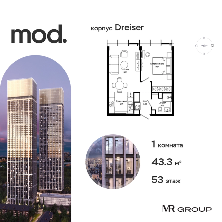 Прямая продажа от застройщика. Жилой комплекс премиум-класса Mod. Продается 1-к квартира общей площадью 43.39 кв. м без отделки в ЖК Mod на 53-м этаже 55 этажного дома. Mod - жилой комплекс премиум-класса в историческом районе Москвы Марьина Роща, состоящий из трех клубных домов (9 этажей) и трёх разноэтажных башен (44-55 этажей). Корпус Mod.D (55 этажей) назван именем знаменитого писателя модерниста Теодора Драйзера. 6 верхних этажей занимают пентхаусы с высотой потолков до 4,8 м. Отделка фасадов выполнена из натурального гранита, что является уникальным архитектурным решением. Чёткие линии тонкой монолитной башни увенчаны светящейся янтарной «короной», выполненной из стекла и ламелей из анодированного алюминия с подсветкой. Закрытая территория жилого комплекса, продуманное благоустройство, эксплуатируемые кровли стилобата, образовательный центр с детским садом создают приватное пространство для тихой семейной жизни, а городская площадь с фонтанами, ресторан, супермаркет, коммерческая инфраструктура на первых этажах привносят созвучную с ритмом города динамику. Преимущества проекта: • В шаговой доступности новый деловой кластер Москвы • Выразительная авторская архитектура • Единственные в Москве фасады башен из натурального камня • Панорамное остекление и высота потолков до 4,8 м • Квартиры и апартаменты с отделкой MR Base • Многоуровневое благоустройство с зонированием на закрытой территории • Многофункциональный образовательный детский центр с детским садом • Двухуровневый подземный паркинг Транспортная доступность: • 5 минут пешком до станции метро «Марьина роща» • 3 минуты до ТТК • 15 минут до Цветного бульвара Компания MR Group предлагает своим клиентам специальные условия приобретения квартир в рамках программ ипотечного кредитования от банков-партнеров.О застройщике