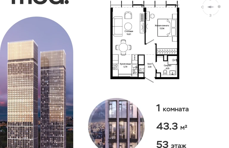 Прямая продажа от застройщика. Жилой комплекс премиум-класса Mod. Продается 1-к квартира общей площадью 43.39 кв. м без отделки в ЖК Mod на 53-м этаже 55 этажного дома. Mod - жилой комплекс премиум-класса в историческом районе Москвы Марьина Роща, состоящий из трех клубных домов (9 этажей) и трёх разноэтажных башен (44-55 этажей). Корпус Mod.D (55 этажей) назван именем знаменитого писателя модерниста Теодора Драйзера. 6 верхних этажей занимают пентхаусы с высотой потолков до 4,8 м. Отделка фасадов выполнена из натурального гранита, что является уникальным архитектурным решением. Чёткие линии тонкой монолитной башни увенчаны светящейся янтарной «короной», выполненной из стекла и ламелей из анодированного алюминия с подсветкой. Закрытая территория жилого комплекса, продуманное благоустройство, эксплуатируемые кровли стилобата, образовательный центр с детским садом создают приватное пространство для тихой семейной жизни, а городская площадь с фонтанами, ресторан, супермаркет, коммерческая инфраструктура на первых этажах привносят созвучную с ритмом города динамику. Преимущества проекта: • В шаговой доступности новый деловой кластер Москвы • Выразительная авторская архитектура • Единственные в Москве фасады башен из натурального камня • Панорамное остекление и высота потолков до 4,8 м • Квартиры и апартаменты с отделкой MR Base • Многоуровневое благоустройство с зонированием на закрытой территории • Многофункциональный образовательный детский центр с детским садом • Двухуровневый подземный паркинг Транспортная доступность: • 5 минут пешком до станции метро «Марьина роща» • 3 минуты до ТТК • 15 минут до Цветного бульвара Компания MR Group предлагает своим клиентам специальные условия приобретения квартир в рамках программ ипотечного кредитования от банков-партнеров.О застройщике