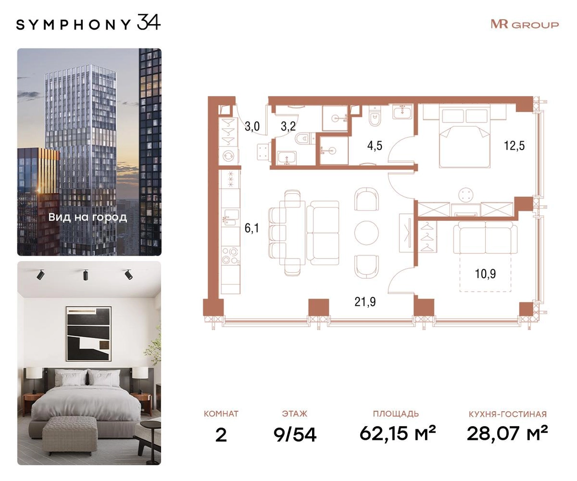 В продаже 2-комнатная квартира площадью 61,3 кв.м. с отделкой MR Base на 9-м этаже 54 этажного дома.