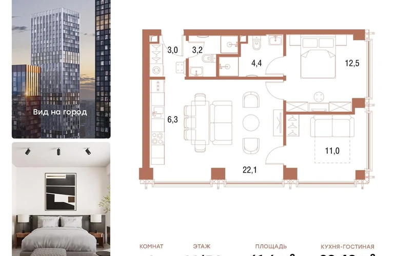 В продаже 2-комнатная квартира площадью 61,6 кв.м. с отделкой MR Base на 22-м этаже 54 этажного дома.