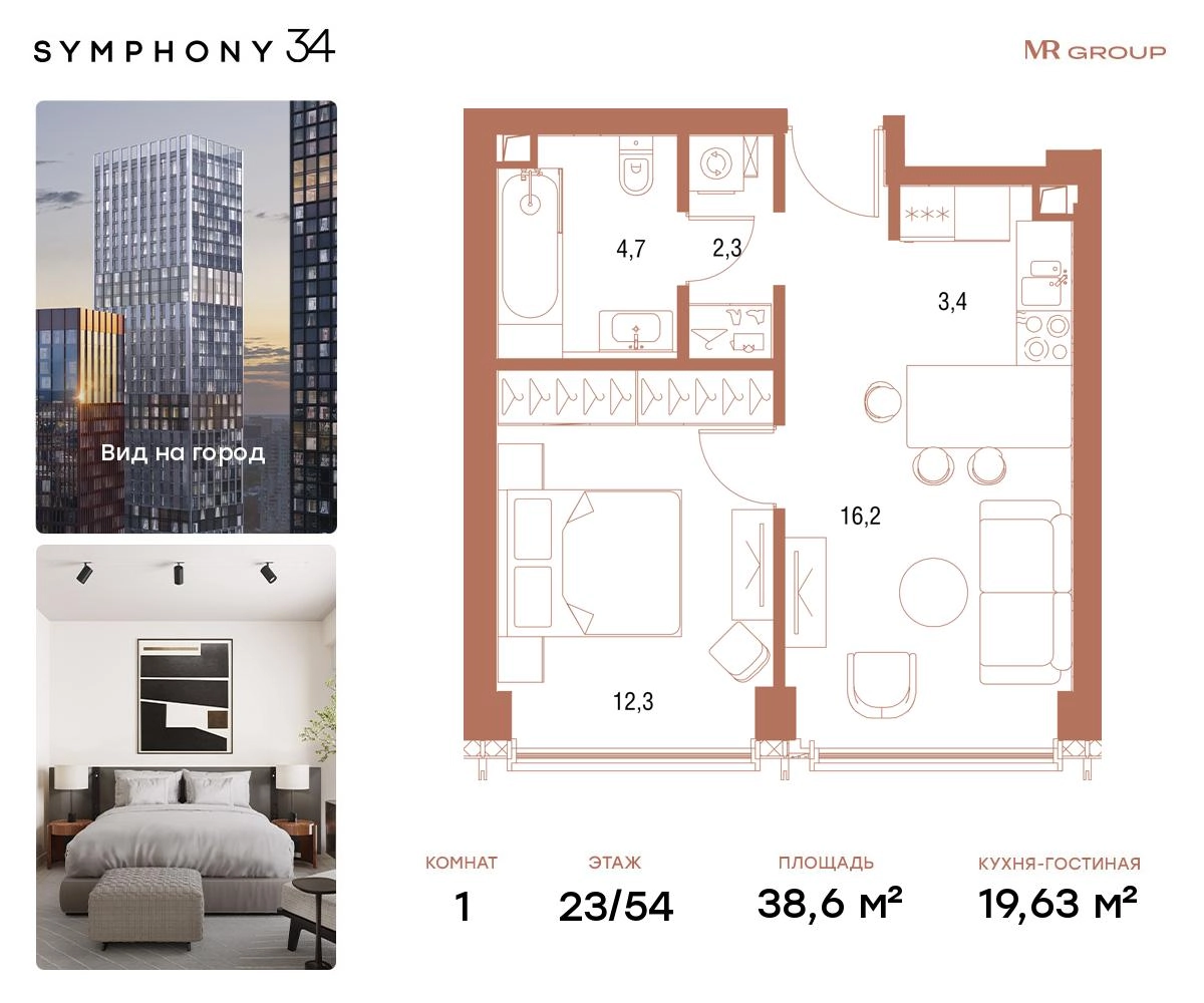 В продаже 1-комнатная квартира площадью 38,6 кв.м. с отделкой MR Base на 23-м этаже 54 этажного дома.