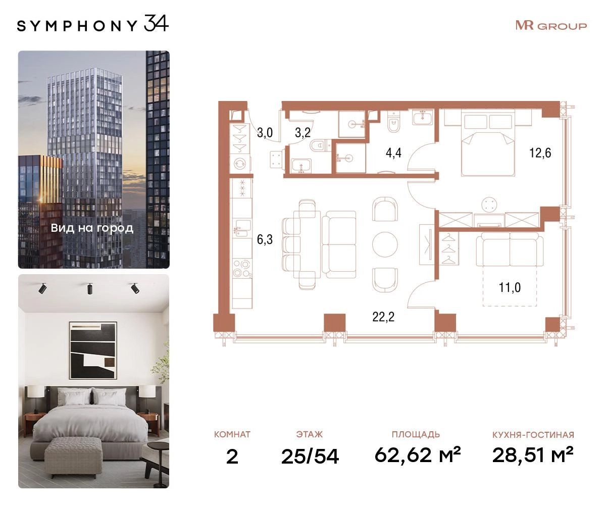В продаже 2-комнатная квартира площадью 61,8 кв.м. с отделкой MR Base на 25-м этаже 54 этажного дома.