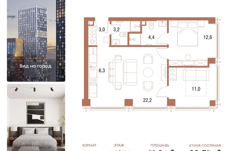 В продаже 2-комнатная квартира площадью 61,8 кв.м. с отделкой MR Base на 25-м этаже 54 этажного дома.