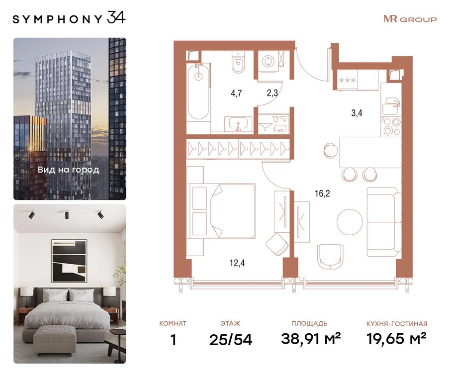 В продаже 1-комнатная квартира площадью 38,4 кв.м. с отделкой MR Base на 25-м этаже 54 этажного дома.