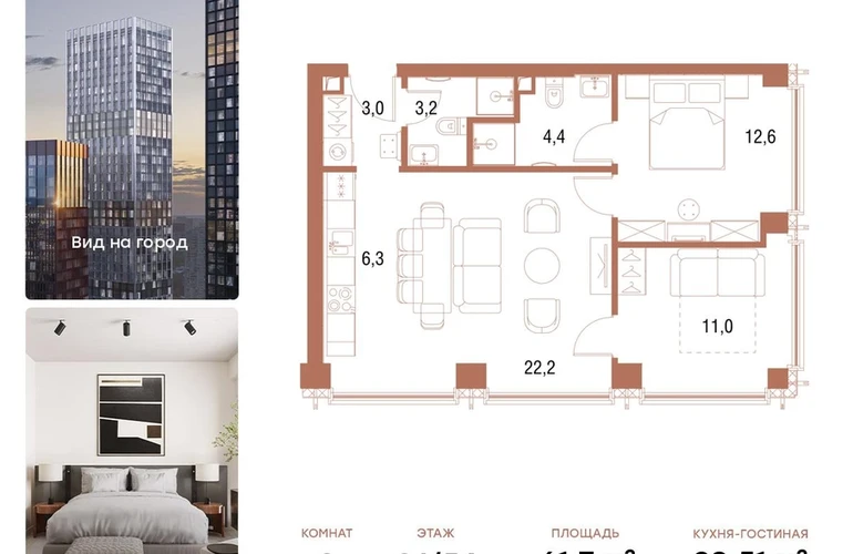 В продаже 2-комнатная квартира площадью 61,7 кв.м. с отделкой MR Base на 26-м этаже 54 этажного дома.