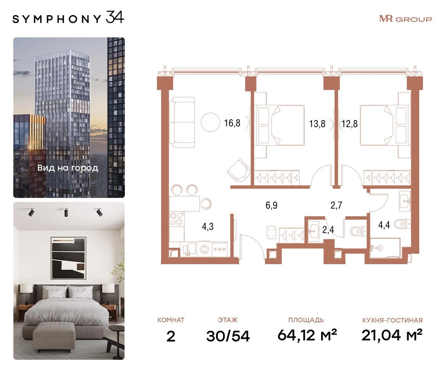 В продаже 2-комнатная квартира площадью 63,6 кв.м. с отделкой MR Base на 30-м этаже 54 этажного дома.