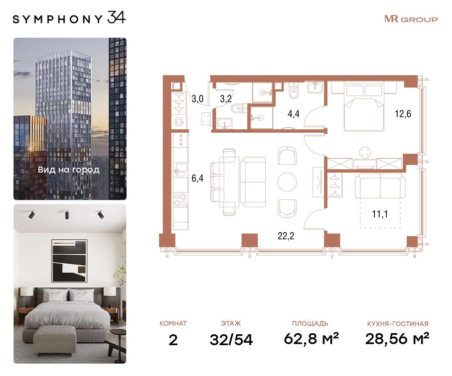 В продаже 2-комнатная квартира площадью 61,9 кв.м. с отделкой MR Base на 32-м этаже 54 этажного дома.