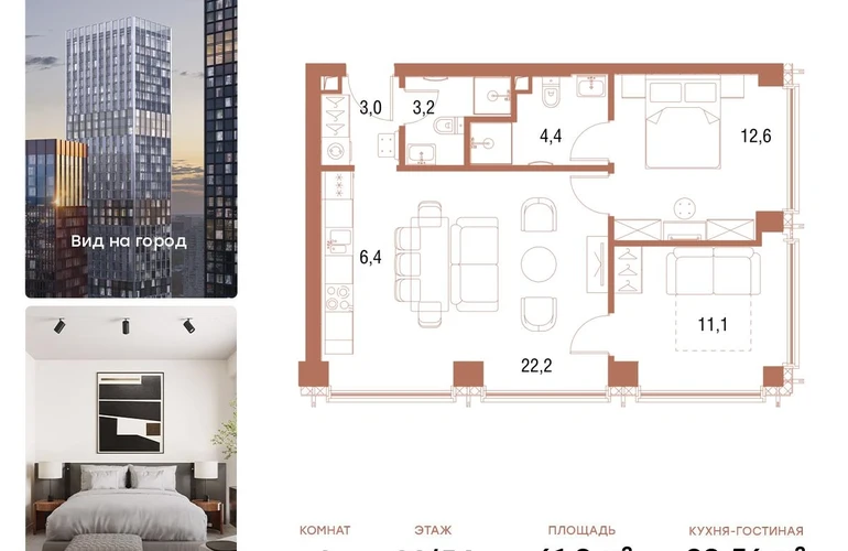 В продаже 2-комнатная квартира площадью 61,9 кв.м. с отделкой MR Base на 33-м этаже 54 этажного дома.