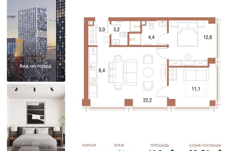 В продаже 2-комнатная квартира площадью 61,9 кв.м. с отделкой MR Base на 34-м этаже 54 этажного дома.