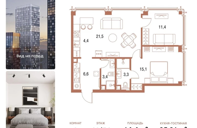 В продаже 2-комнатная квартира площадью 64,4 кв.м. с отделкой MR Base на 40-м этаже 54 этажного дома.