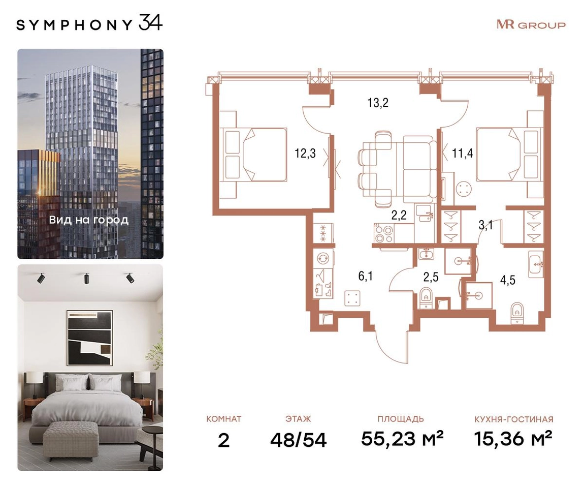 В продаже 2-комнатная квартира площадью 54,2 кв.м. с отделкой MR Base на 48-м этаже 54 этажного дома.