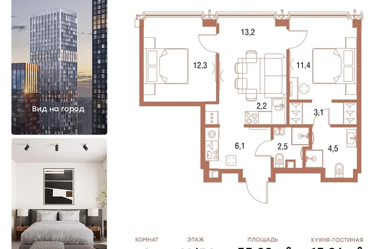 В продаже 2-комнатная квартира площадью 54,2 кв.м. с отделкой MR Base на 48-м этаже 54 этажного дома.