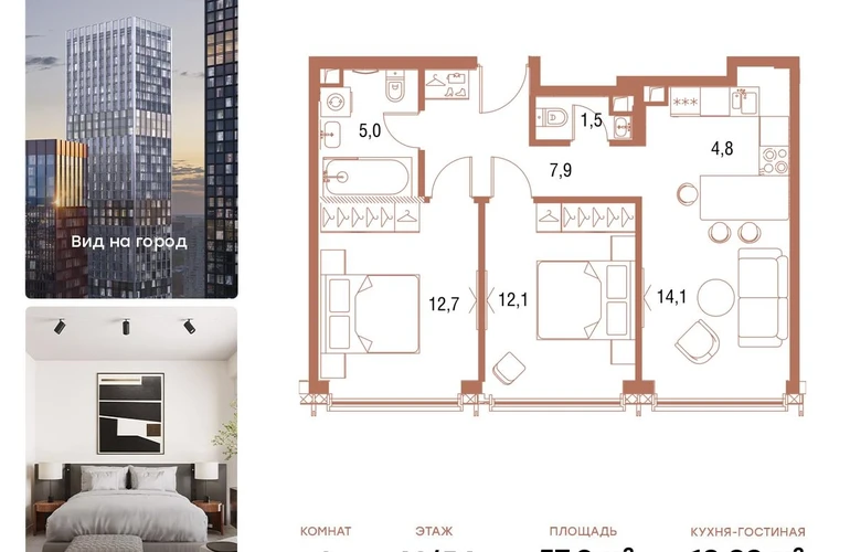 В продаже 2-комнатная квартира площадью 57,9 кв.м. с отделкой MR Base на 48-м этаже 54 этажного дома.
