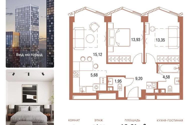 В продаже 2-комнатная квартира площадью 64,3 кв.м. с отделкой MR Base на 4-м этаже 49 этажного дома.