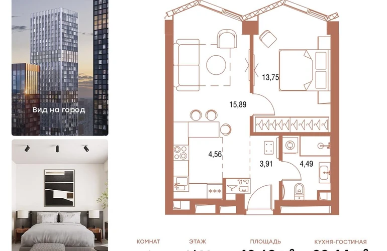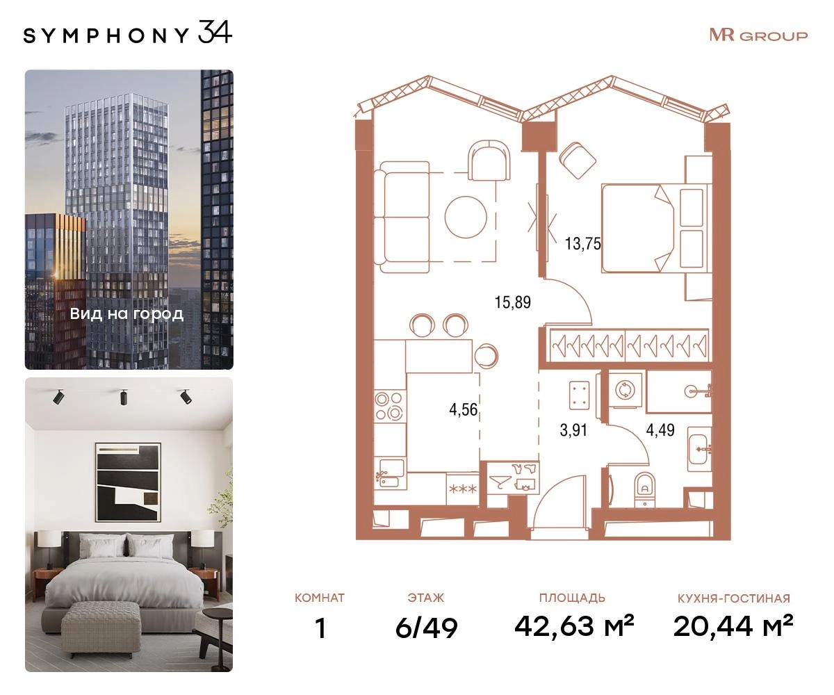 В продаже 1-комнатная квартира площадью 42,9 кв.м. с отделкой MR Base на 6-м этаже 49 этажного дома.
