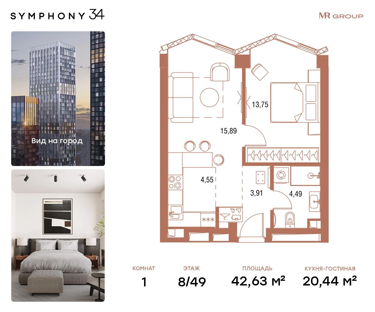 В продаже 1-комнатная квартира площадью 42,9 кв.м. с отделкой MR Base на 8-м этаже 49 этажного дома.