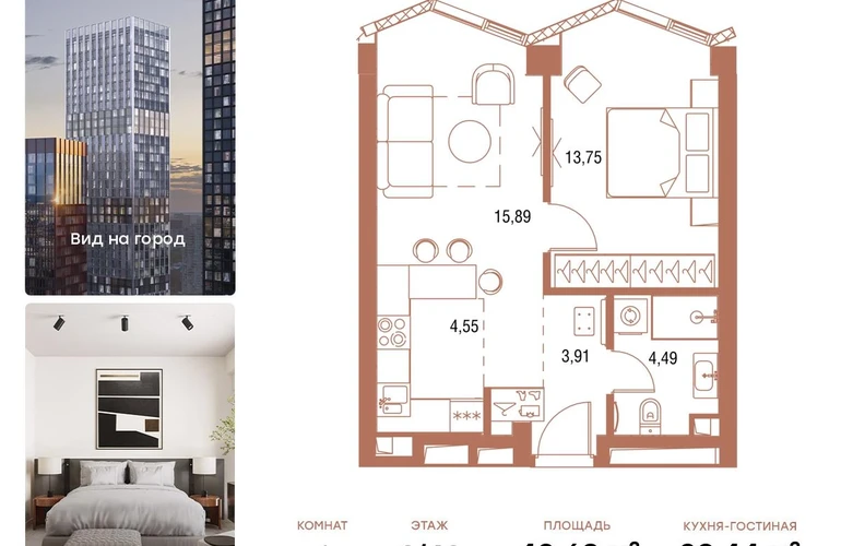 В продаже 1-комнатная квартира площадью 42,9 кв.м. с отделкой MR Base на 8-м этаже 49 этажного дома.