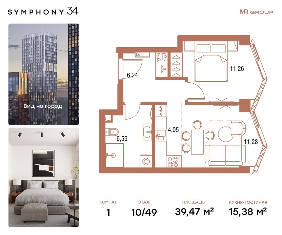 В продаже 1-комнатная квартира площадью 39,6 кв.м. с отделкой MR Base на 10-м этаже 49 этажного дома.