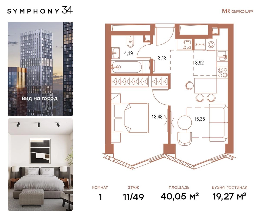 В продаже 1-комнатная квартира площадью 39,9 кв.м. с отделкой MR Base на 11-м этаже 49 этажного дома.