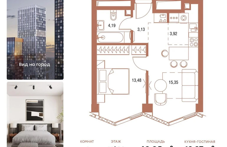 В продаже 1-комнатная квартира площадью 39,9 кв.м. с отделкой MR Base на 11-м этаже 49 этажного дома.