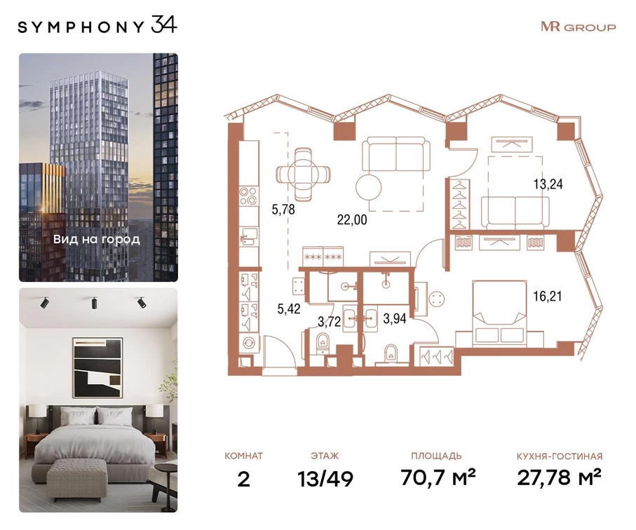 В продаже 2-комнатная квартира площадью 70,7 кв.м. с отделкой MR Base на 13-м этаже 49 этажного дома.